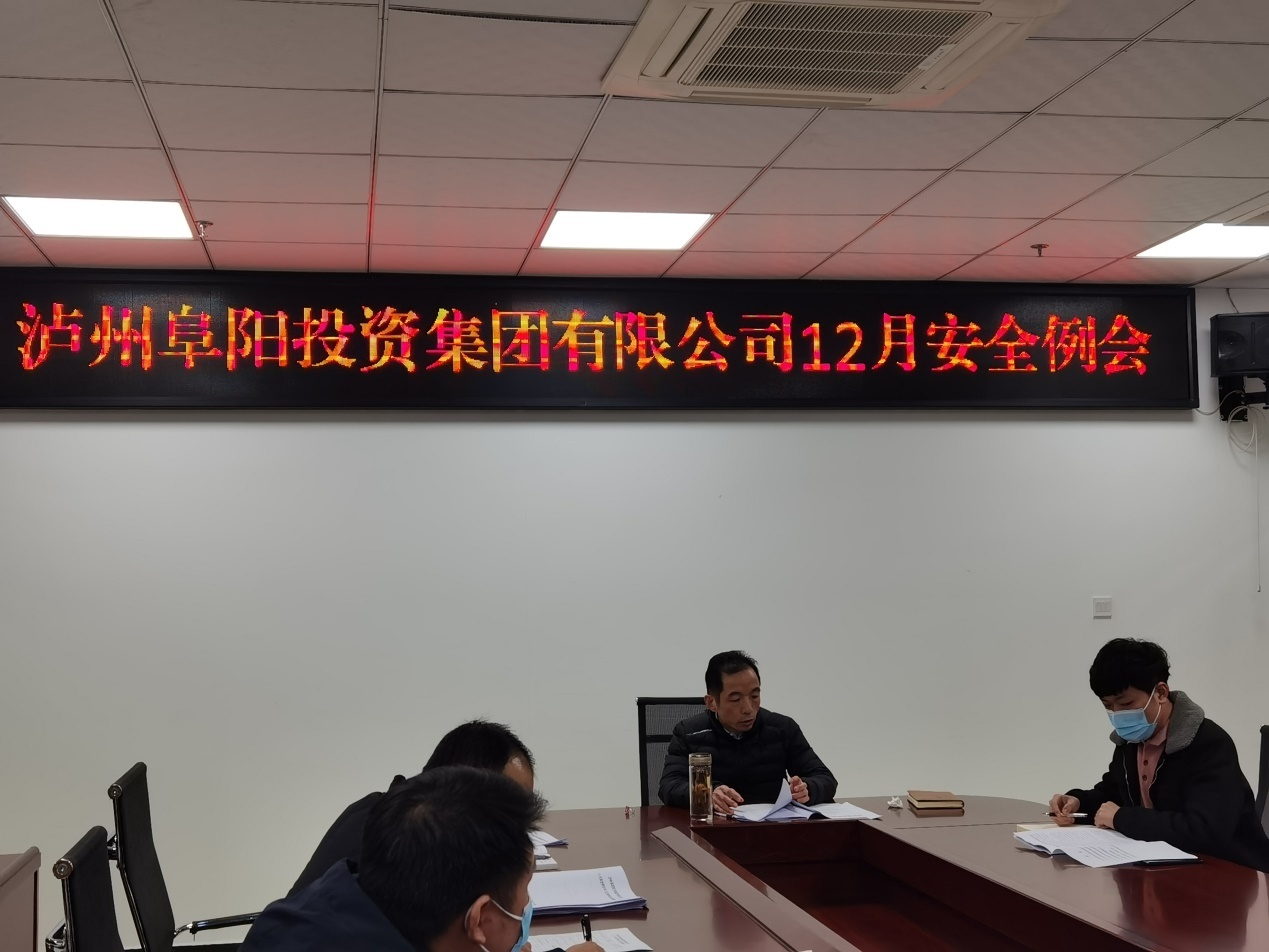 2021 年 12月22日,瀘州阜陽投資集團有限公司召開了12月份安全生產例會,胡天華副總經理帶領大家學習了近期安全生產會議精神,并觀看了火災案例警示教育片。會上胡總要求各級公司做好平時安全防范工作,把安全生產工作落實到最小單元,落實到操作一線,真正做到知責履責、擔責盡責。
