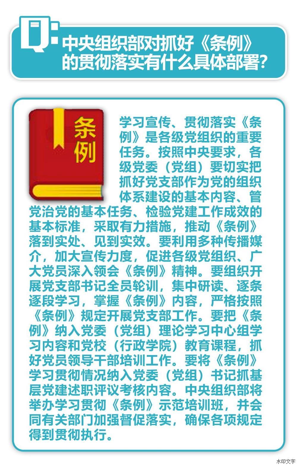 通知強調,重視黨支部、善抓黨支部,是黨員領導干部政治成熟的重要標志。各級黨委(黨組)要牢固樹立政治意識、大局意識、核心意識、看齊意識,切實把抓好黨支部作為黨的組織體系建設的基本內容、管黨治黨的基本任務、檢驗黨建工作成效的基本標準,采取有力措施,推動《條例》落到實處、見到實效。要抓好《條例》的學習宣傳和貫徹落實,利用報紙、廣播、電視和手機、網絡等媒介,通過專題研討、集中培訓等方式,使各級黨組織、廣大黨員特別是黨支部書記深入領會《條例》精神,全面掌握《條例》內容,切實增強貫徹執(zhí)行《條例》的思想自覺和行動自覺。要加強對黨員領導干部的培訓,把《條例》納入黨委(黨組)理論學習中心組學習內容和黨校(行政學院)教育課程,提高各級領導班子抓好黨支部工作、推動黨支部建設的本領。要加強監(jiān)督檢查,對貫徹落實《條例》不力的嚴肅追責問責。中央組織部要會同有關部門加強督促落實,確保各項規(guī)定得到貫徹執(zhí)行。