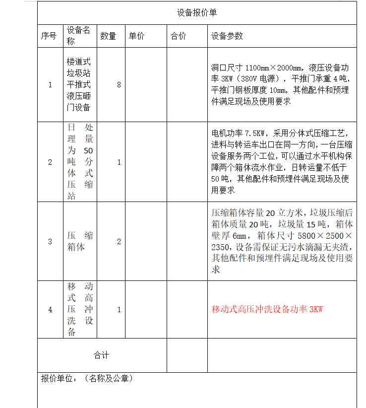 二、詢價(jià)內(nèi)容:1、樓道式垃圾站平推式液壓砸門設(shè)備及其配件8套;2、20立方米分體式壓縮站(包含一臺(tái)壓縮機(jī)構(gòu)、兩個(gè)箱體、一套水平移動(dòng)機(jī)構(gòu)、移動(dòng)式高壓清洗設(shè)備一套)及其配件1套(配套原有勾臂車使用)