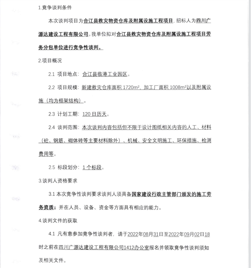 合江縣救災(zāi)物資倉庫及附屬設(shè)施工程項 目 勞務(wù)分包單位競爭性談判的公告