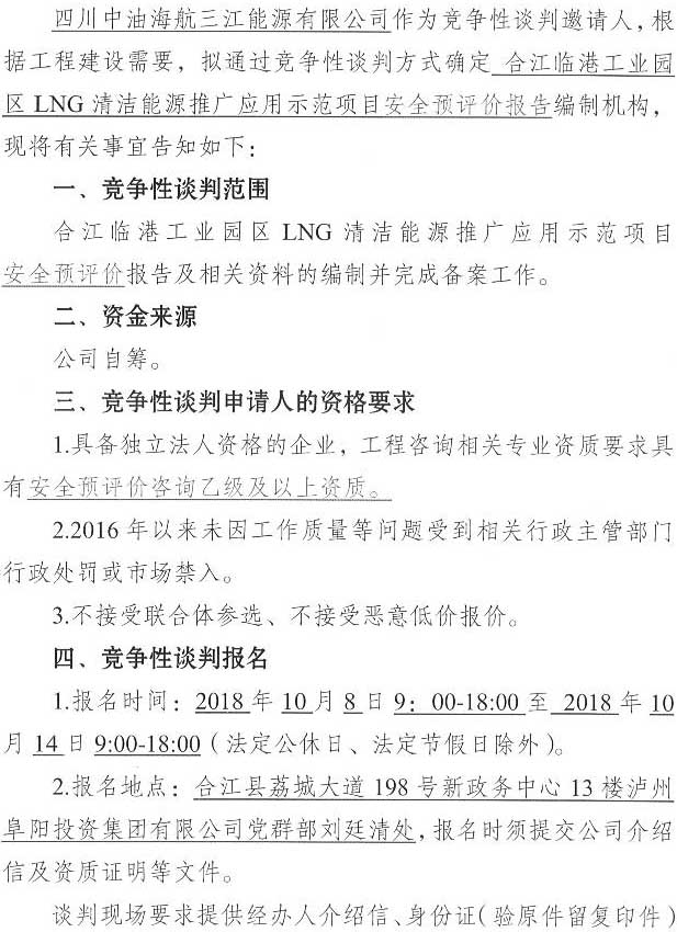 合江臨港工業(yè)園區(qū)LNG清潔能源推廣應(yīng)用示范項(xiàng)目安全預(yù)評(píng)價(jià)單位競(jìng)爭(zhēng)性談判公告.docx