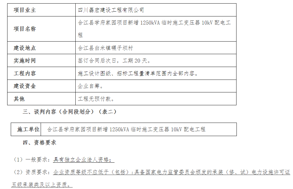 一 、 本 次 談 判 項(xiàng) 目 合 江 縣 學(xué) 府 家 園 項(xiàng) 目 新 增 1250kVA 臨 時(shí) 施 工 變 壓 器 10kV 配 電 工 程 施 工 單 位 , 現(xiàn) 通 過(guò) 競(jìng) 爭(zhēng) 性 談 判方式選擇和確定承包人,誠(chéng)邀符合資格條件的潛在申請(qǐng)人參與本項(xiàng)目的競(jìng)爭(zhēng)性談判。