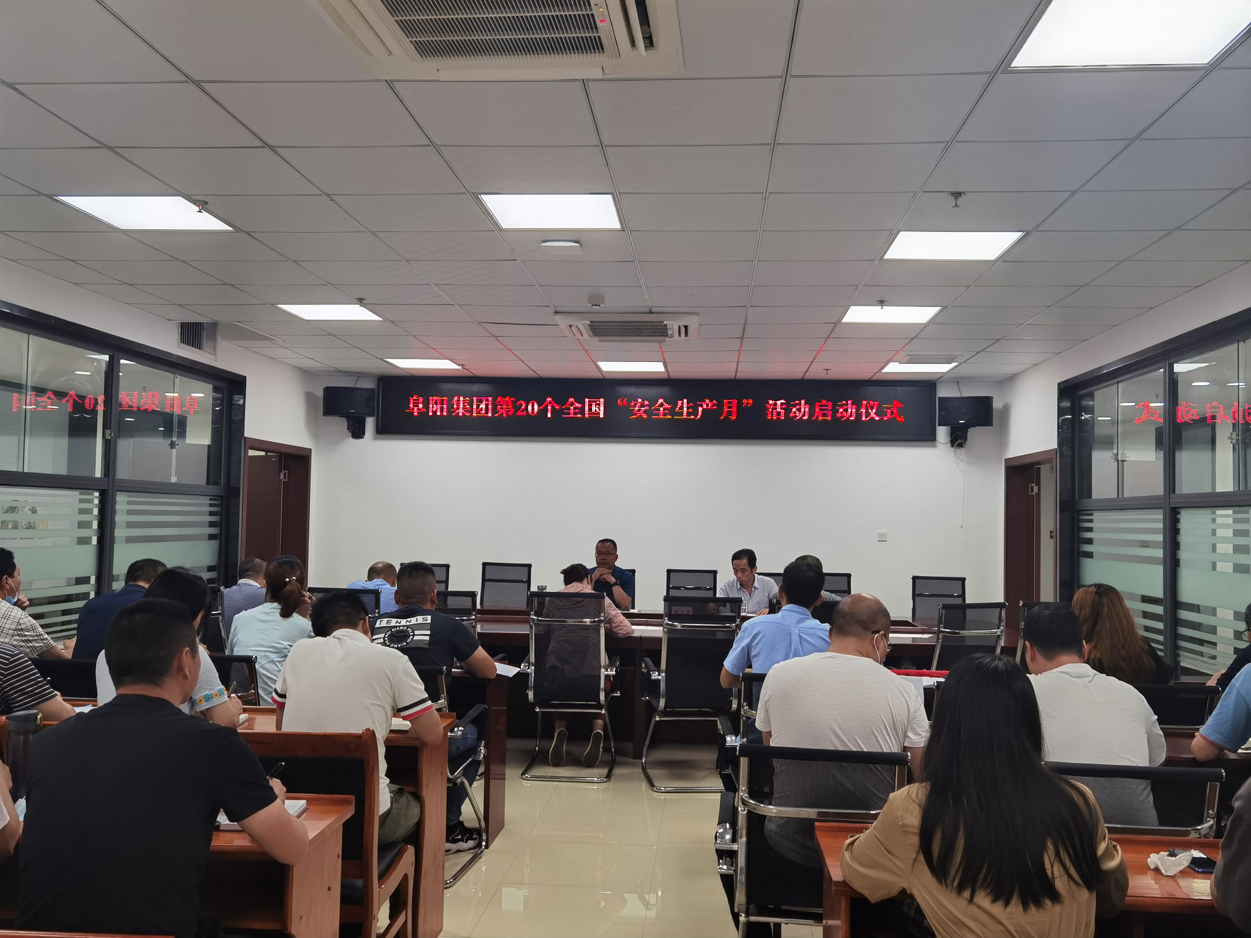 胡天華副總宣讀阜陽集團(tuán)關(guān)于開展2021年“安全生產(chǎn)月”活動方案,并進(jìn)行安全宣誓。最后參會人員在安全條幅上簽名。