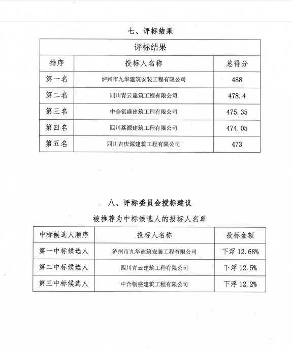 中選單位為:瀘州市九華建筑安裝工程有限公司,中選金額為:以財評總價下浮12.68%。