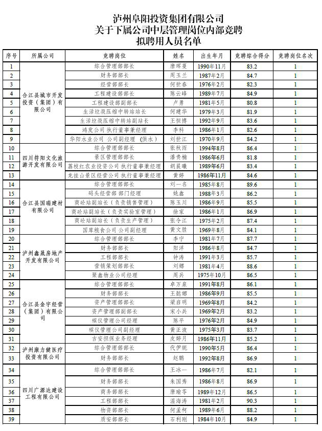 根據(jù)《瀘州阜陽(yáng)投資集團(tuán)有限公司關(guān)于下屬公司中層管理崗位內(nèi)部競(jìng)聘工作的公告》(瀘阜投發(fā)〔2020〕21號(hào))的規(guī)定,經(jīng)阜陽(yáng)集團(tuán)黨委會(huì)研究決定,擬聘用唐琿蔓等39人為瀘州阜陽(yáng)投資集團(tuán)有限公司下屬公司中層管理人員?,F(xiàn)面向社會(huì)公示7日,公示時(shí)間2020年6月19日至2020年6月25日。公示期間,如有問(wèn)題,請(qǐng)及時(shí)向?yàn)o州阜陽(yáng)投資集團(tuán)有限公司組織與人力資源管理部反映。要求舉報(bào)者署實(shí)名,實(shí)事求是地反映問(wèn)題,并提供必要的調(diào)查線索。
