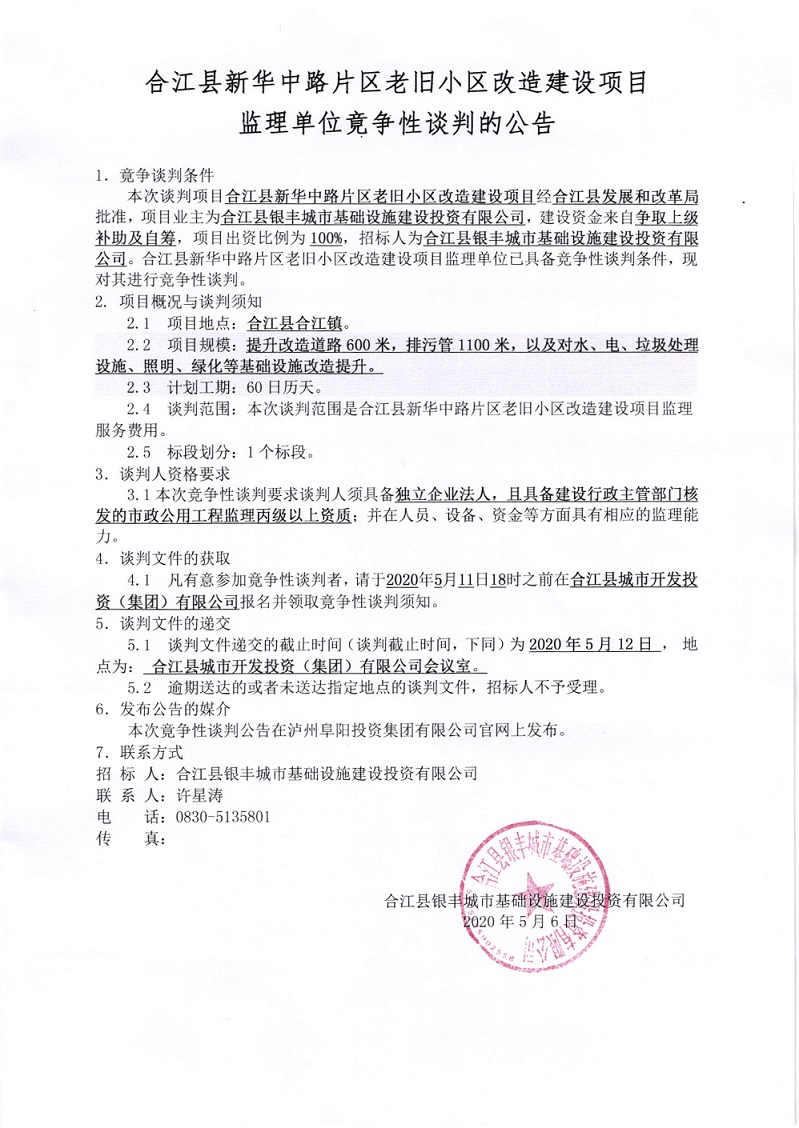 合江縣新華中路片區(qū)老舊小區(qū)改造建設項目監(jiān)理單位競爭性談判的公告