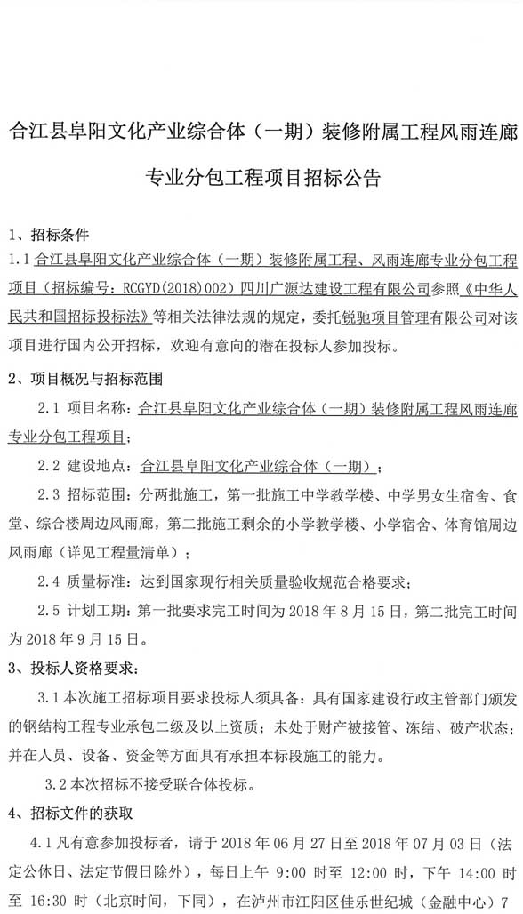 合江縣阜陽(yáng)文化產(chǎn)業(yè)綜合體(一期)裝修附屬工程風(fēng)雨連廊專(zhuān)業(yè)分包工程項(xiàng)目招標(biāo)公告.doc