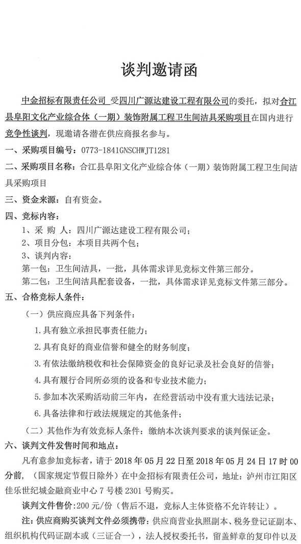 談判邀請(qǐng)函(合江縣阜陽文化產(chǎn)業(yè)綜合體(一期)裝飾附屬工程衛(wèi)生間潔具采購項(xiàng)目).doc